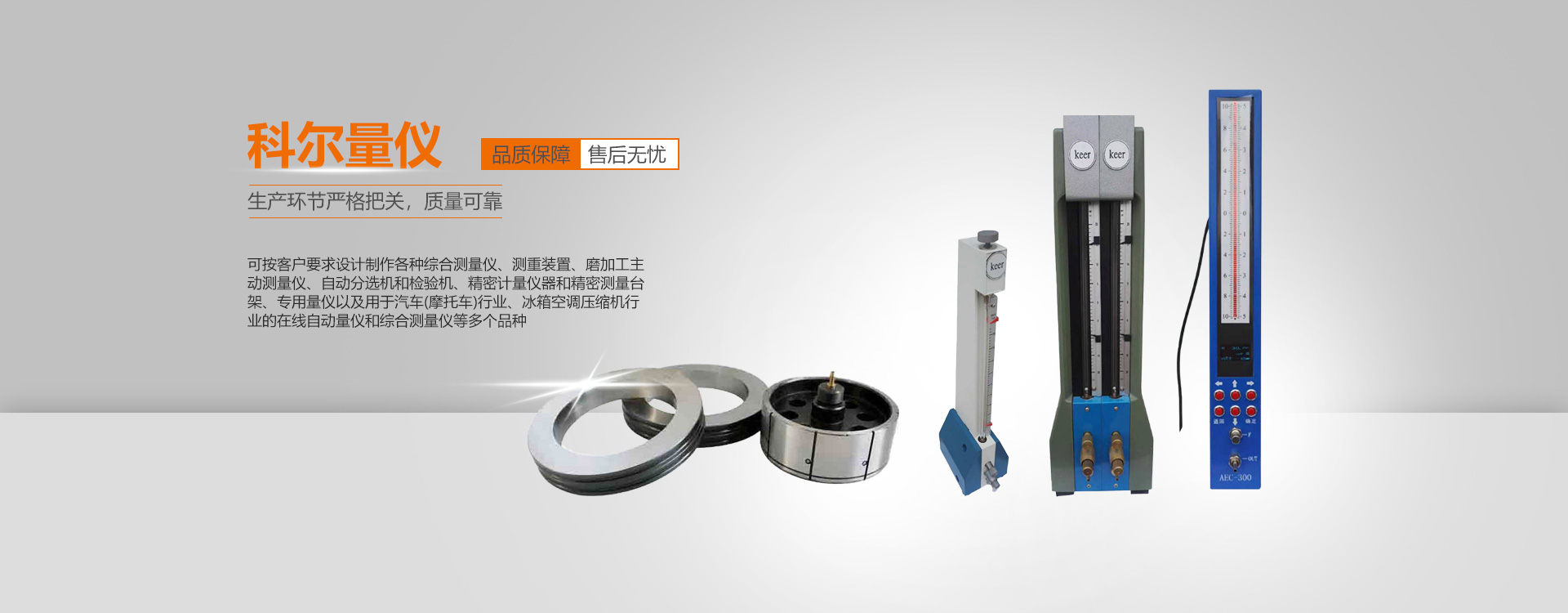 可按客戶要求設計制作各種綜合測量儀、測重裝置、磨加工主動測量儀、自動分選機和檢驗機、精密計量儀器和精密測量臺架、專用量儀以及用于汽車(摩托車)行業、冰箱空調壓縮機行業的在線自動量儀和綜合測量儀等多個品種。
